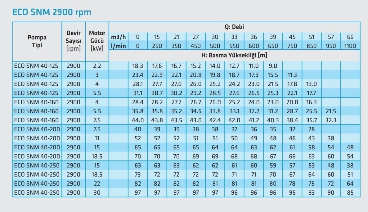 Not : Kapasite tablolarındaki değerler bilgi amaçlı olup. Pompaların nihai seçimi online seçim programından yapılmalıdır.